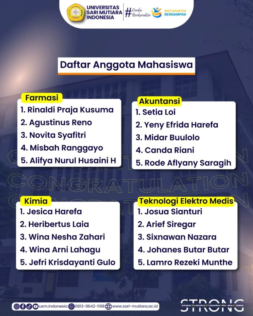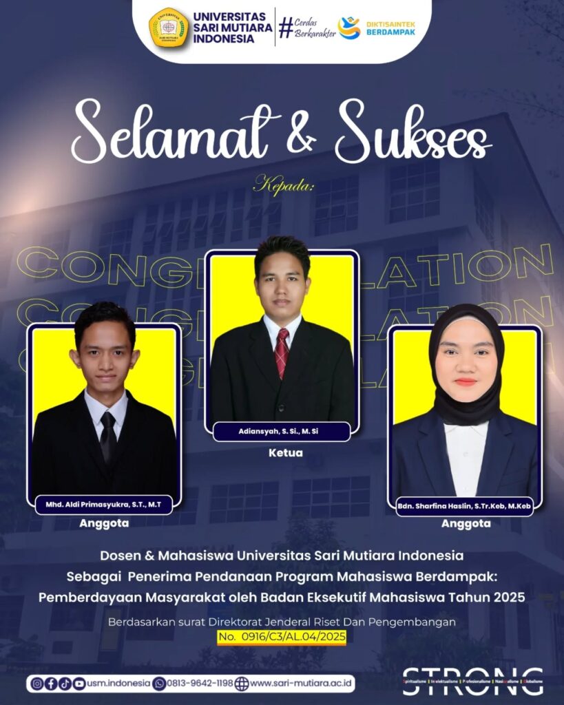 Selamat dan Sukses kepada Dosen dan Mahasiswa Universitas Sari Mutiara Indonesia yang lolos sebagai Penerima Pendanaan Program Mahasiswa Berdampak : Pemberdayaan Masyarakat oleh Badan Eksekutif Mahasiswa Tahun 2025.