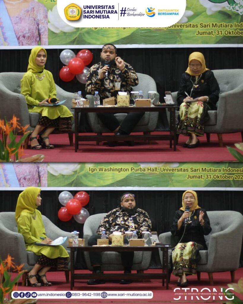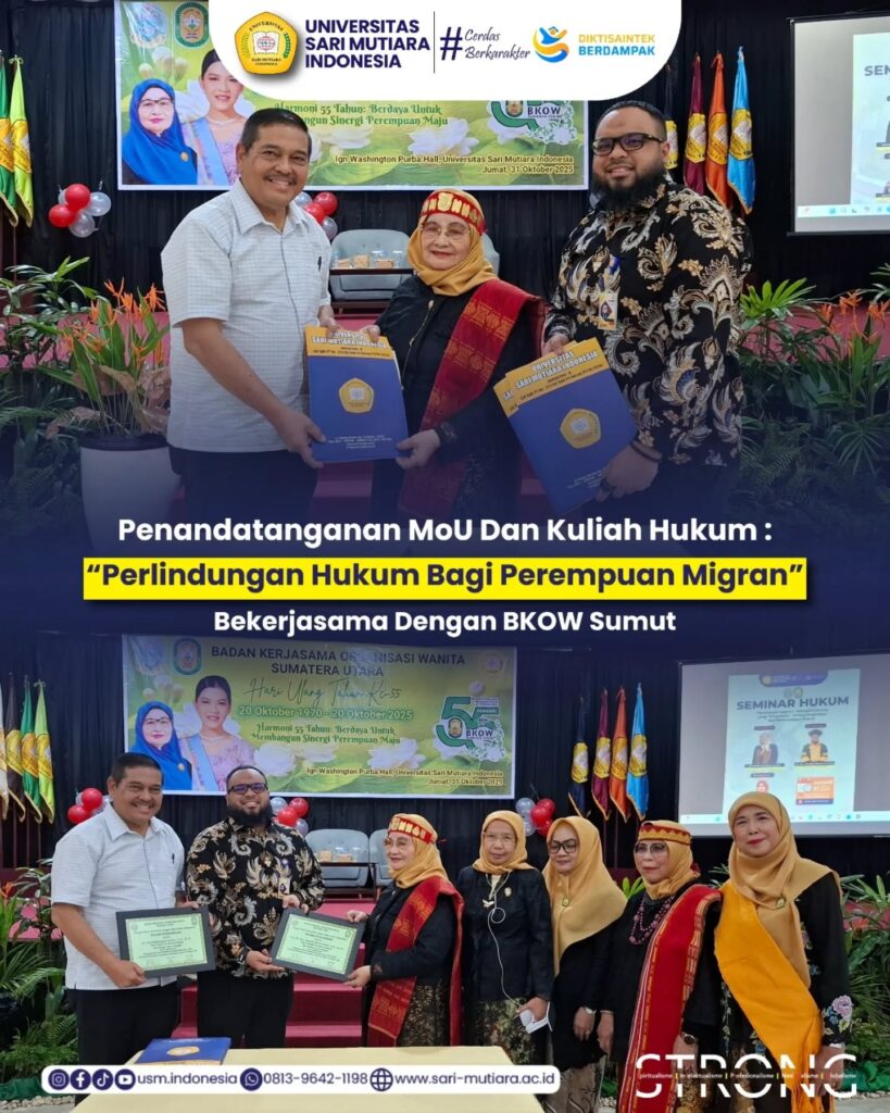 USM-Indonesia | Fakultas Hukum Universitas Sari Mutiara Indonesia bekerjasama dengan BKOW Sumut melaksanakan kegiatan Kuliah Hukum bertema “Perempuan Migran : Pahlawan Devisa yang Terlupakan – Antara Eksploitasi dan Perlindungan Perempuan”, bertempat di Ign. Washington Purba USM-Indonesia pada hari Jumat (31/10/2025).