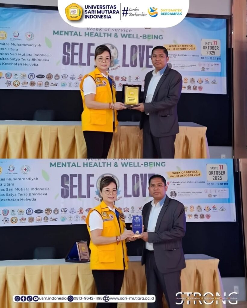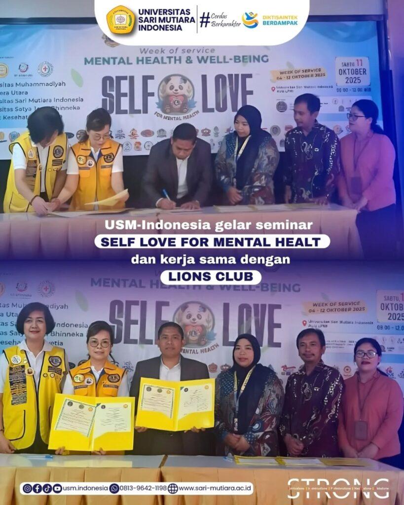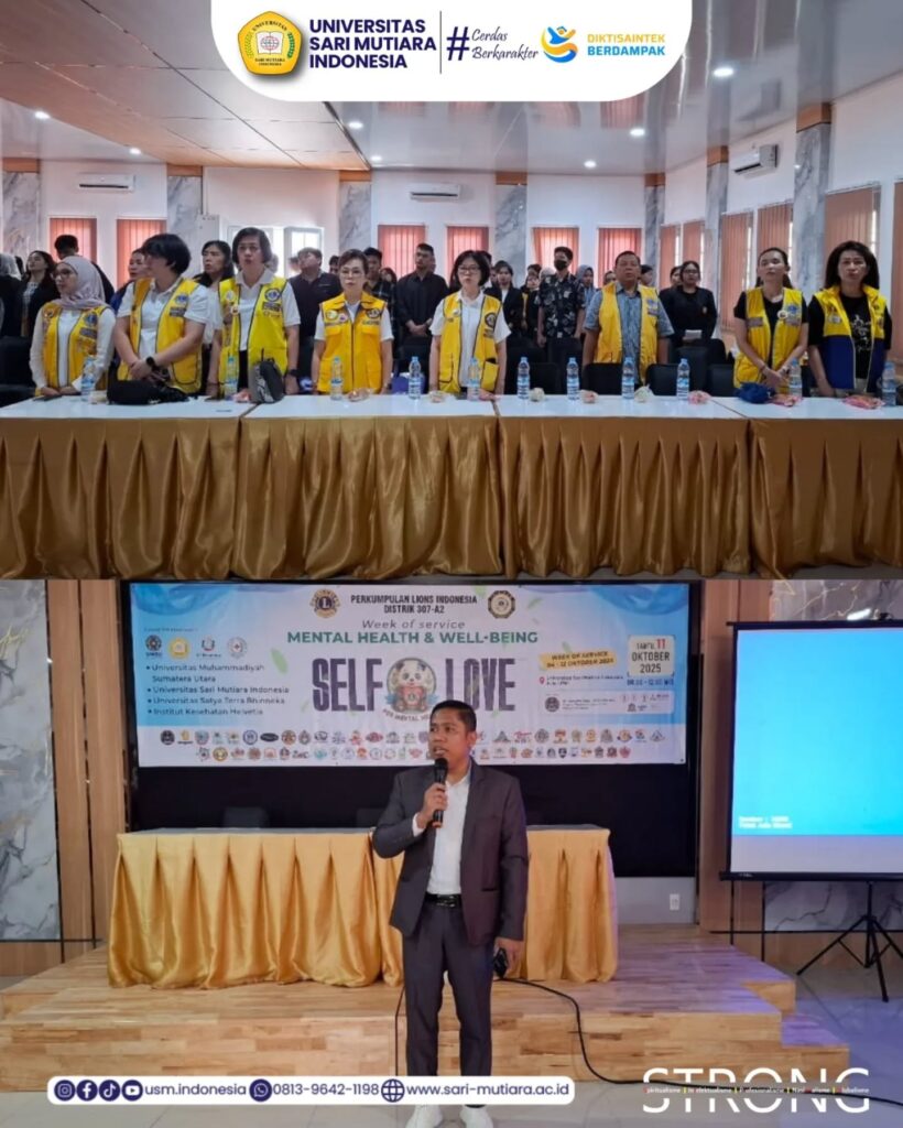 Universitas Sari Mutiara Indonesia (USM-Indonesia) Gelar Seminar Self Love for Mental Healt dan kerja sama dengan Lions Club bertempat di Aula LPMI USM-Indonesia, Sabtu (11/10/2025). Acara ini bertujuan untuk meningkatkan kesadaran mahasiswa akan pentingnya mencintai diri sendiri sebagai upaya menjaga kesehatan mental.